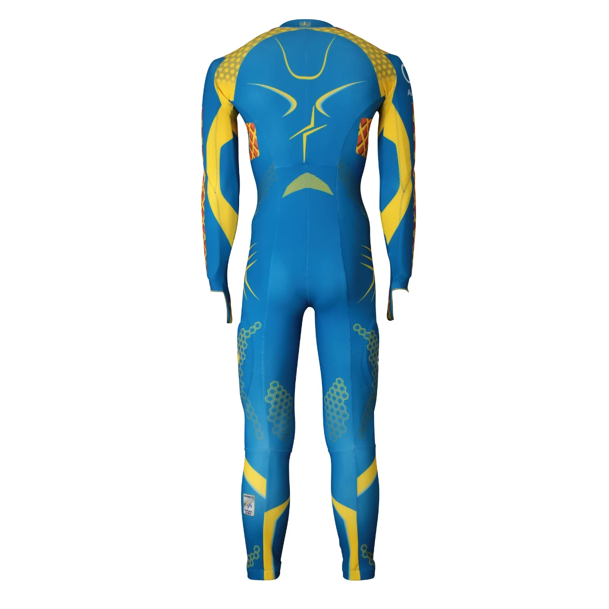 Kombinezon posiada strategicznie umieszczone paddingi ochronne na newralgicznych miejscach, chroniące przed upadkami i urazami bez ograniczania prędkości. Zaawansowane właściwości termiczne utrzymują komfort w trudnych warunkach pogodowych. Wyposażony w oficjalne naszywki Sweden Ski Team i sponsorów, co podkreśla autentyczność sprzętu zawodniczego.