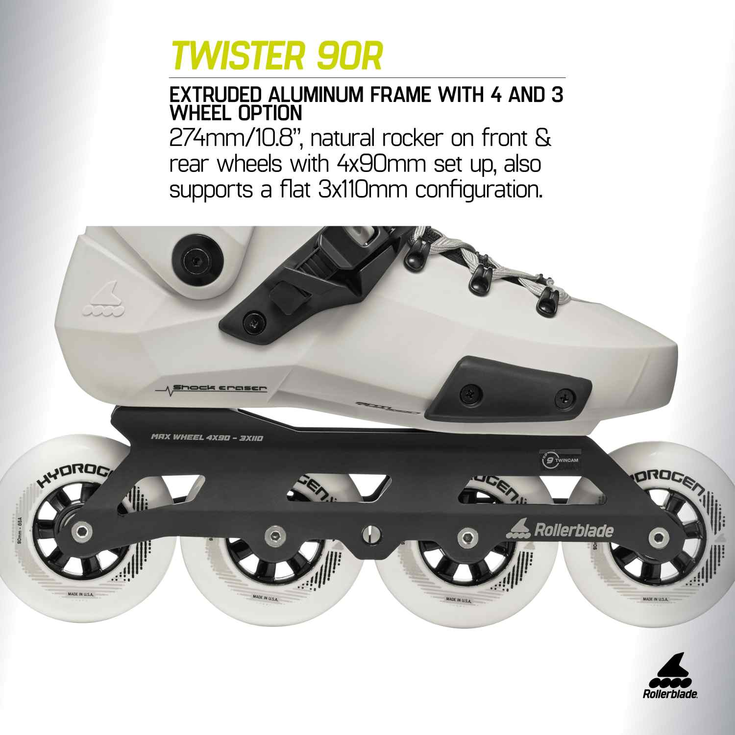 - EXTRUDED ALUMINUM FRAME – RAMA ALUMINIOWA Z OPCJĄ 4 I 3 KOŁA – 274 mm/10,8″, naturalny rocker na przednich i tylnych kołach z rozstawem 4×90 mm, obsługuje również płaską konfigurację 3×110 mm, osie wyścigowe, regulowane bocznie (maks. 4×90/3×110 mm)