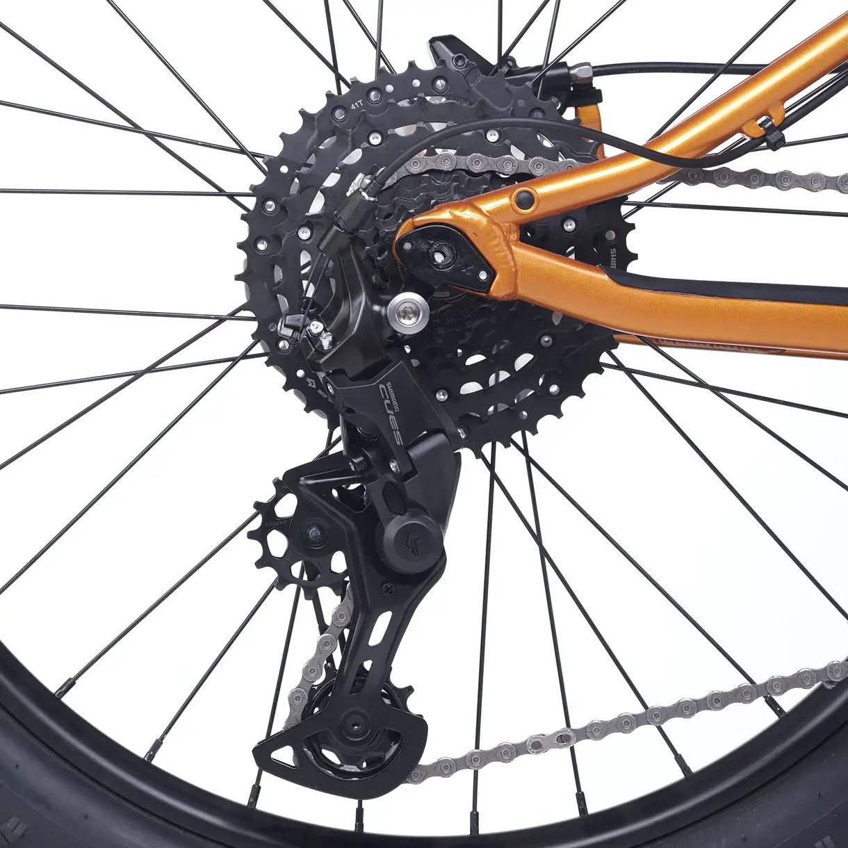 - Wydajny napęd: 1×9 przełożeń z kasetą 11-36T (technologia LINKGLIDE) – cicha zmiana biegów, szeroki zakres na podjazdy i zjazdy, odporna na zużycie.